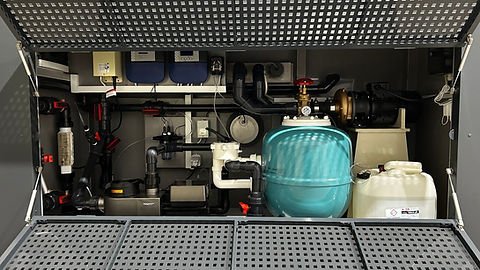 Grazie alla pompa di calore integrata e all’isolamento termico, la temperatura dell’acqua può essere mantenuta costante tutto l’anno. Il punto forte del design è l’ampia finestra panoramica da 4 metri che valorizza l’estetica e offre una sensazione di ampiezza eccezionale. Completano il tutto la copertura automatica scorrevole in policarbonato con porte e telecomando, proteggendo la piscina e prolungando la stagione balneare.